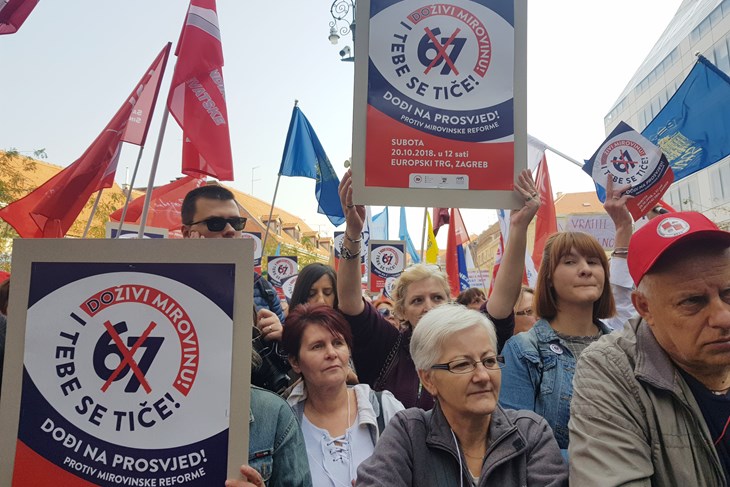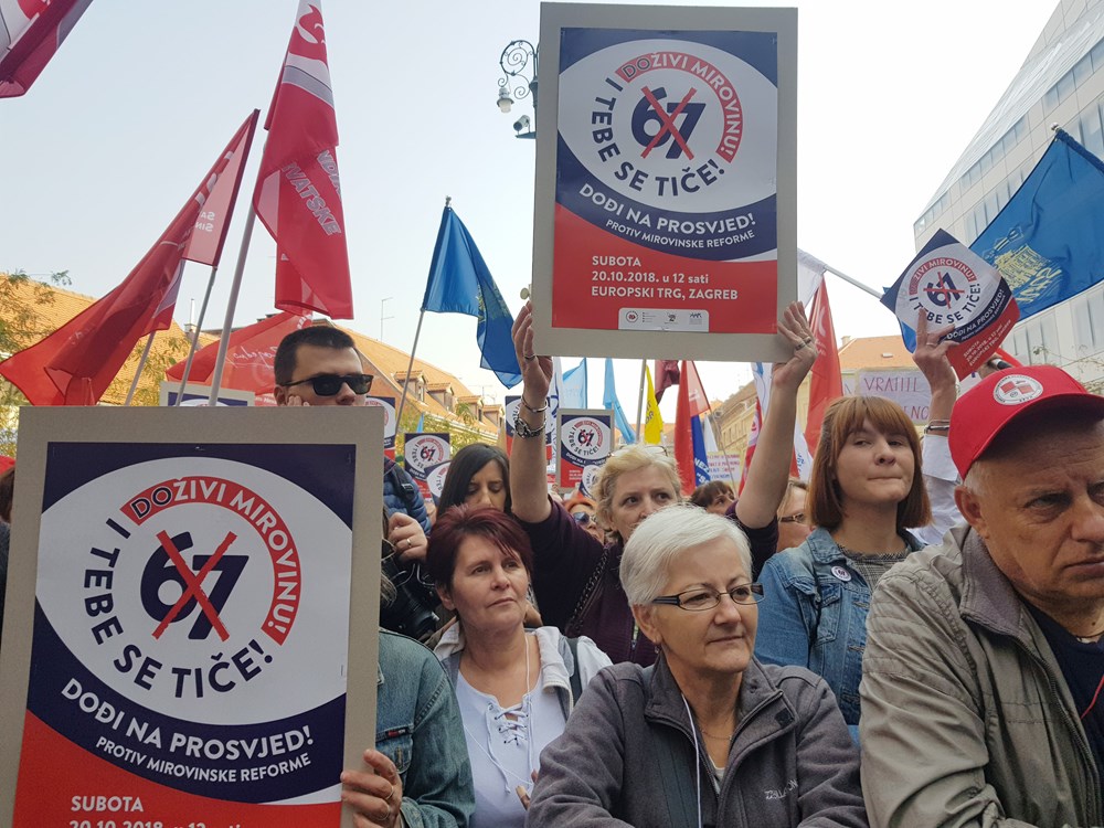 Prosvjedni skup protiv najavljene mirovinske reforme pod nazivom "Doživi mirovinu i tebe se tiče" u organizaciji triju sindikalnih središnjica - Saveza samostalnih sindikata Hrvatske (SSSH), Nezavisnih hrvatskih sindikata (NHS) i Matice hrvatskih sindikata (MHS), započeo je u podne na zagrebačkom Europskom trgu.